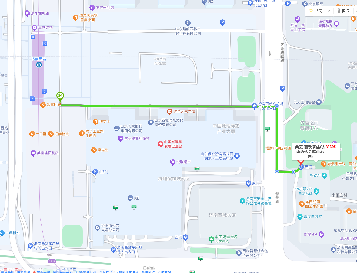 推荐步行路线:乘车至济南西站,东出口出站后沿东广场向东步行约500米过马路至齐州路东侧,右转向南步行约100米后即到达酒店,步行时长约9分钟。